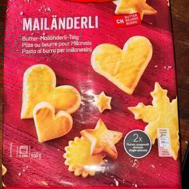 Dovete sapere che qui in Svizzera, nel periodo di Natale, si usa molto acquistare la pasta frolla, già pronta, per fare i biscotti. Si trovano nel banco frigo dei supermercati e ci sono di tantissimi gusti come al cocco, nocciole, zenzero, cannella, cioccolato, burro... La stendi e la lavori a tuo piacimento, con tante formine possono venir fuori tantissimi e meravigliosi biscotti gustosi. Sono apprezzate molto anche per le crostate, cosa che dovrei provare a farla un giorno. Preparare i biscotti di Natale è una bellissima attività natalizia da fare con i bambini, infatti permette a loro di dare tanto spazio alla fantasia e alla creativà, creando veramente delle grandi opere d'arte. Sono momenti che creano ricordi bellissimi che porteranno sempre con loro nel cuore. I miei figli amano mettere le mani nell'impasto, si divertono quando prepariamo la pizza, quando prepariamo i ciambelloni oppure amano impastare anche la pasta modellabile o il semplice Slime che facciamo noi stessi. È un attività che gli ho sempre fatto fare fin da bambini... (nel periodo di Pasqua, con farina, sale e acqua, facevamo la semplice pasta di sale e ci divertivamo, a modellare dei coniglietti e delle uova, che dopo averle messe in forno per farli indurire, da freddi, passavamo alla pittura con pennelli e colori acrilici..) I biscotti fatti in casa sono anche un idea regalo di Natale, imballandoli per bene, si possono anche spedire per posta, una delle usanze natalizie svizzere. Massimiliano e Melissa quest'anno non vedono l'ora di fare i biscotti con queste paste frolle che io non ho mai usato... perché? Perché la pasta frolla la preparo sempre io 😂, però ho voluto aprire gli orizzonti e buttarmi su questa nuova esperienza. Ho anticipato i tempi, affrettandomi nei supermercati, già da oggi, cioè 10 Dicembre, per cercare di trovare le paste frolle disponibili, visto che, in questo periodo vanno a ruba e rischi facilmente di non trovarle più... anche perché le si trovano solo in questo periodo natalizio. Con Patrick ci siamo consultati su quali gusti scegliere, più che altro gusti che possano piacere a tutti e così ci siamo buttati sulla classica base di burro, una sulle nocciole e un altro sul cookie 🤩... al cioccolato la preparerò io... almeno uno lo faccio con le mie mani 😂. Ho preso i zuccherini da mettere sopra, anche al cioccolato... non poteva non mancare la glassa, presa anche quella, al cioccolato 😂... cioccolato....cioccolato e cioccolato 🤣. La glassa non l'ho mai fatta, non so nemmeno come si prepara, lo scoprirò insieme ai miei figli quando prepareremo i biscotti🥰. Ho comprato anche una casa da costruire in Pan di Zenzero... non per me... ma come regalo 😅. È carina da fare, più che altro da costruire 🤦🏻♀️... da come leggo nella descrizione della scatola, per assemblare la casa, servirebbe solo l'albume d'uovo montato con zucchero... forse il prossimo anno la farò, quest'anno ho preferito regalarla. Calcolando che il Pan di Zenzero non è che mi faccia impazzire come gusto.