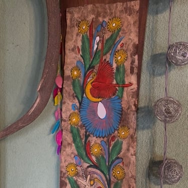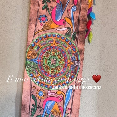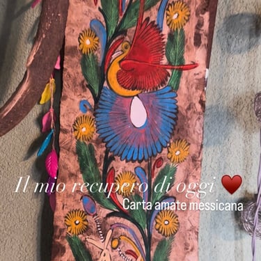 Lo so di essere mezza streghetta io, sabato avevo troppa voglia di andare al compostaggio e con la scusa di buttare alcune cose siamo andati appena poco dopo esserci alzati. Appena arrivati giù e buttando un occhio su quello che c'era degli oggetti salvati, ho visto che non c'era niente. Ci stavo rimanendo male ma poi, non so cosa, la mia curiosità mi ha portato a vedere sopra dei banconi, cosa c'era. Vi dico solo che era impossibile notarli e vederli, dovevi per forza andarli a cercare. Mai e poi mai mi sarei aspettata quello che poi mi sono trovata tra le mani. Disegni su carta amate messicana...😍 stavo per svenire, non ci credevo. Questi bellissimi dipinti li ho notati in alcune case dove sono andata a lavorare e per me è stato amore a prima vista. Non so perché ma pensavo fossero egiziani 😂, mai sarei arrivata al Messico. Ho fatto una piccola ricerca e per chi non lo sapesse la carta amate è un antico materiale fibroso mesoamericano, prodotto artigianalmente fin da I millennio a.C. bollendo e battendo la corteccia degli alberi di Fico e Moraceae ( non so nemmeno che pianta è 😏). Originaria del Messico, questa carta resistente di colore marrone o bianca viene tuttora realizzata dalla comunità Otomi, utilizzata sia per rituali che per la creazione di artigianato folcloristico decorativo, celebre per i suoi dipinti vivaci. Li costudirò con gelosia. Per adesso li ho appesi in casa e se vedo che mi si vanno a rovinare li metterò in cornice con un vetro per proteggerli. Dove sono ora non hanno il sole diretto e poi non è un posto umido, anzi... In più ho trovato una scatolina vintage bellissima in marmo che ho preso e un mobiletto in noce carinissimo nel suo piccolo ma soprattutto in ottusissime condizioni. Ovviamente lo modificherò, già ho scelto degli adesivi da mettere con colori adatti all'ambiente del salone. Ho deciso di optare per gli adesivi perché sono più versatili, e per queste piccole modifiche lo trovo una soluzione ottima, anche se io amo disegnare ma è pur sempre dargli una seconda vita. Vi mostrerò poi il risultato finale.