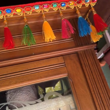 Quando sono venuta ad abitare in questa casa, Patrick fin dall'inizio mi ha dato sempre carta bianca per decorare, arredare casa a mio piacimento, sapendo come a me piace. Fortunatamente i nostri gusti sono sempre stati simili... e per chi mi conosce sa che io amo i colori. Tra le poche cose che Patrick non voleva dare via è la credenza di sua nonna che ha su per giù sui 100 anni. All'inizio avevo il rifiuto perché dentro era stra colmo di video cassette... ma dopo, studiandoci un po sopra e amando lo stile rustico ho deciso di mettere dentro (ovviamente levando tutto quello che c'era dentro) tutto quello che occorre per la camera da letto, in bella vista visto che ha le vetrate trasparenti e ricamati. Ho comprato degli adesivi thailandesi e infine ho preso delle nappe colorate stile messicane ( io ero convinta che erano stile indiane ). Devo dire la verità che la credenza della nonna ha preso una nuova vita colorata e con un disegno unico che solo lei avrà. Sono contenta del mio risultato. Le nappe colorate le ho messe sul bordo della cornice superiore, non sapevo come fissarle, ma avendo in casa l'adesivo double-face che è molto forte, ho pensato che fosse la soluzione migliore... infatti tiene che è una meraviglia. Chissà la nonna di Patrick cosa penserebbe... di una cosa ne sono certa.. mi ringrazierebbe per non averla data via e per averla resa unica a mio piacimento e che in casa vive ancora il suo ricordo♥️.