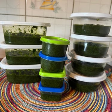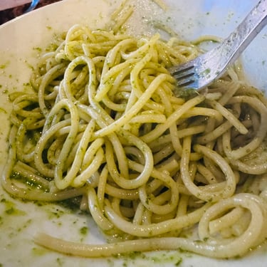 Questo aglio orsino ha girato tanto nel blog, dalla scorsa settimana che siamo andati a raccoglierlo🤪... ma non potevo non concludere senza condividere con voi il procedimento che ho fatto per fare il pesto e i spaghetti per la pasta. Allora, ho le foto ma non tutte. Dovete oramai capirmi e conoscermi bene umanamente che non lo faccio apposta. Quando cucino le prime volte cose nuove, non penso alle foto perché sono troppo concentrata. In più, se quella ricetta non dovesse venire buona, non la pubblicherei mai. Non penso a fare numero dei post nel mio blog, mi piace pubblicare le ricette dove sono sicura al 100% che vengono buone e che gli ingredienti che vi scrivo, sono quelli giusti e perfetti...vabbè a parte il sale e lo zucchero che sono scelte personali😜. Allora, noi avendo raccolto ben 515 gr di foglie orsino, ci servono 650 ml di Olio Extra Vergine d'Oliva. Io per sicurezza ho lavato le foglie per bene, aggiungendoci un cucchiaio abbondante di bicarbonato dove ho lasciato in posa solo per 20 minuti buoni, per non rischiare che le foglie appassissero per il peso dell'acqua. Comunque sono foglie very strong 😂... toste, non si sono mai ammosciate, calcolando che le abbiamo raccolte il giorno prima e la notte le abbiamo messe in frigo, dentro un vassoio per mantenerle fresche. Dopo averle scolate, le ho messe dentro a dei strofinacci da cucina per far si che si asciugassero da sole piano piano, e cosi è stato. Santa pazienza venia in noi ora... Ho preso il frullatore, piano piano mettevo le foglie dentro il contenitore apposito, dopo aver schakerato, le foglie tritate, le ho messe dentro a una ciotola grande. Cosi per circa mezzora, fino a che non ho finito tutte le foglie. Ci vuole pazienza perché non puoi fare pressione sulle foglie per cercare di metterle il più possibile dentro il contenitore del frullatore, devono rimanere larghe, anche perché fai prima cosi, sennò pressandole, fa difficoltà a tritare. Quando ho finito le foglie, ho preso la ciotola dove avevo tutto il tritato, piano piano ci ho aggiunto l'olio e ho continuato a tritare ma con il frullatore a immersione. Beh, vi dico che in cucina si respirava aria di fresco, ed era bellissimo. Non odorava di aglio, ma di fresco, come quando porti in casa il basilico... che io adoro. Dopo averlo tritato e in base ai miei grammi sia di foglie e di olio, ho aggiunto 25 gr di sale. Una figata vedere con il sale, come il verde del pesto prendeva vita, impressionate e magico🤩. Il pesto è pronto. Non ho voluto mettere la frutta secca e formaggio per il semplice fatto che andava a noscondere il sapore dell'aglio orsino, chi lo vuole lo aggiunge al suo proprio piatto. Noi l'abbiamo provato con il pecorino ed é buonissimo. Ma naturale al 100% è il top. Ho fatto delle ricerche per capire come dovevo dividere la porzione per congelare il mio pesto, visto che di pesto ne era venuto su per giù 1 kg. Per due persone sono 130 gr. Facendo cosi, mi sono venuti 8 barattoli e ho fatto in più 4 mono dose per una persona. Chiusi e messi nel congelatore...ovviamente tranne quello che mi serviva per i spaghetti🤣. Ho messo la pentola con l'acqua a bollire e ho buttato 300 gr di spaghetti... in due 😗. Cotta la pasta, l'ho scolata e condita con il pesto fresco e mangiata... adorooooooo!!🥳