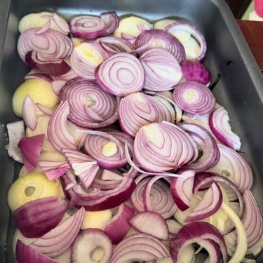 Sicuramente sarà capitato anche a voi di vedere ultimamente sui social questa meravigliosa torta. Fortunatamente a me e Patrick ci piacciono da morire le cipolle e quando sono andata a fare spesa, vedendomi davanti nello scaffale delle verdure, una cipolla bianca e una rossa, belle grandi, ho deciso di buttarmi e provare questa ricetta che ne parlano tutti. É una torta al contrario, cioè si prepara mettendo nel vassoio di cottura prima la base sopra e poi il sotto. Miraccomando preparatevi a piangere tanto... le cipolle sono cosi grandi che ora che hai finito di tagliarle sembra come che hai appena visto un film strappa lacrime o una storia di Maria De Filippi a C'è posta per te 😂. Anche questa ricetta facilissima, si può fare in tante versioni ma la più succulente sono quella caramellata e quella semplice in bianco. Io mi sono buttata su quella caramellata. Allora, iniziamo a tagliare le cipolle a rondella fine, se ci riusciamo... prendiamo il vassoio e mettiamo abbondante olio, crema di aceto balsamico, miele e se vi piacciono qualche spezia. Io le spezie, sono sincera, non sono riuscita a vedere cosa poteva stare bene con la cipolla, non essendo cuoca, non sapevo cosa abbinarci, perciò, mi sono buttata con un pizzico di aglio e un po di pepe. Secondo passaggio aggiungiamo le cipolle nel vassoio sopra alle salse appena messe e per concludere mettiamo la pasta sfoglia sopra a coprire. Prima di metterla in forno bucherelliamo con una forchetta la pasta sfoglia per non farla gonfiare e sopra spennelliamo un po di olio per farla venire croccante. Mettiamo in forno a 180 gradi cottura sopra e sotto e lasciamo cuocere per 25 minuti. Fate anche a vostro occhio, quando vedete che la parte sopra è diventata scura, croccante ( non bruciata 😅 ) potete toglierla. Capovolgete la torta su un piatto e il piatto è pronto !! É talmente cosi buona che non vedo l'ora di rifarla. La prossima volta voglio provarla semplice, senza caramellare le cipolle... sono curiosa. Non sapevo dove mettere questo piatto qui nel blog, in quale categoria, come secondo o antipasto... ma va bene per tutte e due. Noi l'abbiamo mangiato a cena ma puo diventare un buonissimo antipasto... a chi piace la cipolla. Non rimane pesante perciò può essere ottima anche per un primo appuntamento 😜.