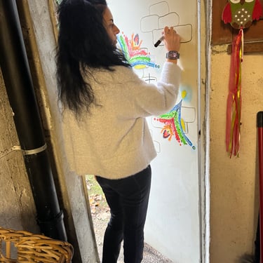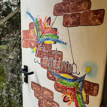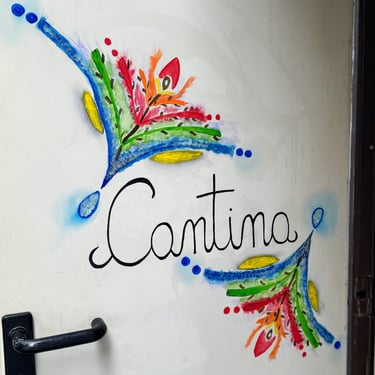 ... come avete ben letto, ho sistemato, almeno una parte, la cantina di casa, per dare piano piano vita al mio angolo di lavanderia. Ne ho approfittato proprio perché doveva arrivarci l'asciugatrice nuova. È la mia prima asciugatrice, non potevo non dargli un bel benvenuto in casa. A parte gli scherzi... sistemando il tutto, ho notato che la porta era troppo bianca. Si, avete ragione, vi starete chiedendo come mai me ne sono accorta solo ora visto che ci abito in questa casa e ci entro in cantina quasi la maggior parte del giorno 😅....ma c'è un perché ! Accanto alla porta d'ingresso, collegata al giardino, c'è una mini finestrella in legno. Ho deciso di metterci una mini tendina, per dargli uno stile più rustico. Non vedendosi più, anche di quel poco, il verde del giardino, esce ancor di più il risultato del Total White della porta. Così, ho iniziato come prima cosa, ha fare una scritta centrale... semplicemente ¨cantina¨.Lo ammetto, qui ho dovuto usare il righello per rendere la scritta dritta e centrale nel suo punto giusto... ma solo come base. Dopo aver fatto la scritta, ho iniziato direttamente con i miei colori acrilici a disegnare e come fantasia mi sono usciti questi ciuffi colorati come se fossero dei fiori. Per me il disegno poteva finire qui, ma il giorno dopo ho iniziato a creare dei mattoni e sono rimasta veramente orgogliosa per il risultato finale. A scuola un professore di arte mi insegnò questo segreto : ¨Quando si crea un disegno di libera fantasia, prima di renderlo definitivamente chiuso, fai riposare gli occhi e distrai la testa. Se per due giorni, riguardando il tuo disegno, non ti esprime niente di nuovo, potrai dire che il tuo lavoro è totalmente finito!¨. Aveva ragione, a me aiuta tantissimo e in questo caso il riposo e la distrazione mi ha aiutato a capire che nel disegno mancava ancora qualcosa. Mi sono divertita a colorare i mattoncini perché sembrano veramente realistici ( spero che in foto riusciate a vederli bene ), non c'è stata nessuna tecnica particolare. Dopo aver usato il colore principale, il marrone, sopra ho passato un po di color pesco per schiarire il marrone in diversi punti. Passando il pennello, il colore suo sotto originale, cioè il marrone, si è andato leggermente a togliere 😅 creando questa mega figata di sfumatura. Pensate cosa ho scoperto oggi, una cosa nuova... certo sono stata fortunata perché la porta, la base dove ho pitturato, è di un materiale che mi ha permesso di fare questo gioco. Su un altro piano di base già sarebbe stato impossibile visto che avrebbe assorbito il colore. Alla prossima creazione... ne ho tante in testa !! La cantina ancora dobbiamo finirla... piano piano ce la faremo.