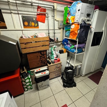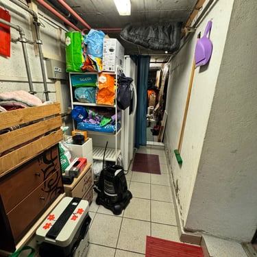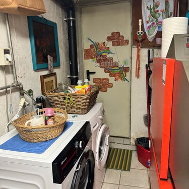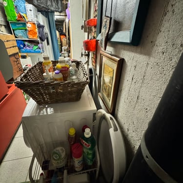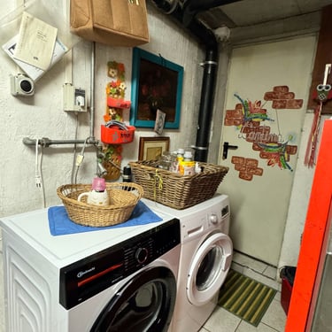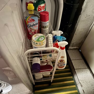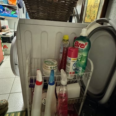 Ciao a tutti👋🏼, come già vi avevo accennato, ho sistemato in primis, la parte iniziale della cantina, quella che si collega alla porta di casa che nel giardino. La settimana scorsa aspettavamo l'asciugatrice e volevo creare piano piano un angolo lavanderia. Mi sono messa a spostare e a togliere tantissime cose intuii. Ad esempio, io non so voi, ma avevo di quelle tante buste per la spesa, rigide, che compri direttamente al supermercato, che potevo rivendermele tranquillamente e farci tanti soldi. Per non parlare di quelle di carta🤦🏻‍♀️. Da una parte quelle di carta sono comode per quando fai la differenziata e devi buttare tanta carta, metti tutto li dentro e senza svuotare i sacchi, butti anche quello. Ho fatto una cernita delle buste quelle più rigide, e quelle più rovinate, gli ho tolto i manici per renderli sacchetti da coprire gli elettrodomestici depositati in cantina... bella idea e comoda, ve la consiglio. Ho fatto spazio per l'asciugatrice, vicino alla lavatrice. Patrick nella cantina esterna del giardino, aveva un mini carrellino in ferro bianco. Ho deciso di portarlo in casa mettendolo vicino alla lavatrice e mettere tutto ciò che riguarda le pulizie... grassatore, sapone, quello per i vetri, per spolverare etc... Avevamo recuperato anche un mobiletto bianco in ferro tempo fa, anche quello portato in cantina. Tante cose ora hanno un filo logico e sono collegate tra loro, senza usare google maps per andare a trovare quello che ti serve 😂. Siamo andati a comprare i tappetini colorati in bambù da mettere in terra, io li adoro perché sono facilissimi da pulire...lavi per terra...lavi il tappeto. Siamo ancora lontano dal finale, quello che abbiamo fatto non è nulla di definitivo ancora, ma stiamo già a un passo non grande...ma grandissimo. La cosa bella, di quando sistemi le cose che trovi più piacere ad entrare in quell'ambiente proprio perché ti da soddisfazioni del lavoro che stai facendo. Domenica siamo riusciti anche a togliere l'armadio in tessuto... che poi, abbiamo tante cose, ma alla fine se le metti sul tavolo, tante cose non sono. È il più di come sono messe in disordine che sembrano facciano volume e quantità. Abbiamo avuto l'idea anche di usare una tenda da doccia, facile da tenere pulita e lavare, per dividere i due locali della cantina. Insomma, il colore non manca nemmeno in cantina e mi piacerebbe con calma dare anche un tocco alle pareti con un color sabbia. Ho riportato dentro un porta oggetti che avevo tolto in salone. In realtà quello era nato per il bagno, ma essendo fatto in bambù, ai tempi lo avevo abbellito per metterlo in salone come svuota tasche. Poi mi aveva un pò stancato e lo tolsi dandogli un altra disposizione. Sistemando la cantina, l' ho ritrovato e ho avuto l'idea di posizionarlo nella parete sopra alla lavatrice e asciugatrice, cosi ci appoggio tutte le cose che servono per i macchinari.... come la spazzola per pulire i filtri dell'asciugatrice e via dicendo...
